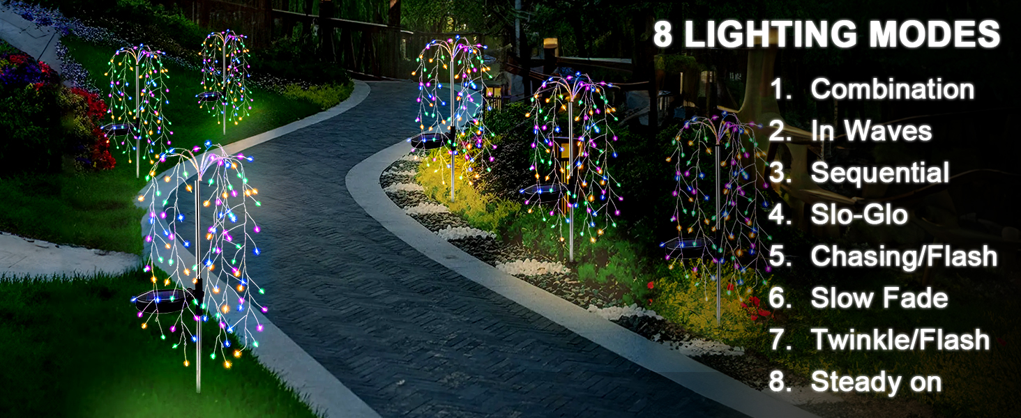 【8 Lighting Modes】Our solar garden decorative lights feature eight distinct lighting modes, including combination, wave, sequential, slow glow, chase/flash, slow fade, flash, and steady on. These modes can be easily selected with the press of a button on the solar panel, making them perfect for enhancing flower beds, pathways, patios, and verandas. They are the ideal outdoor accents for holiday aisles, weddings, Thanksgiving, Christmas, and Halloween.